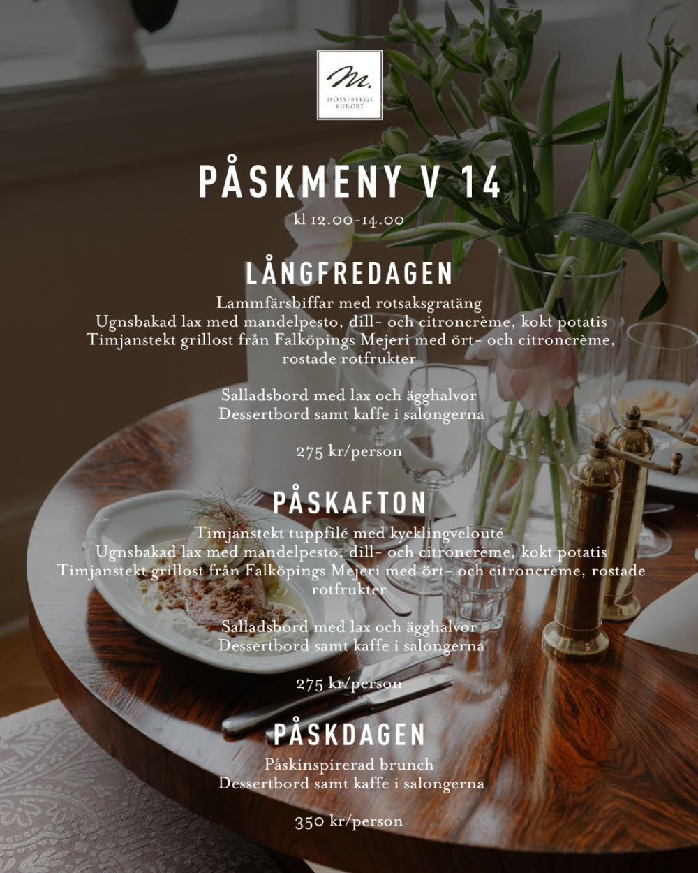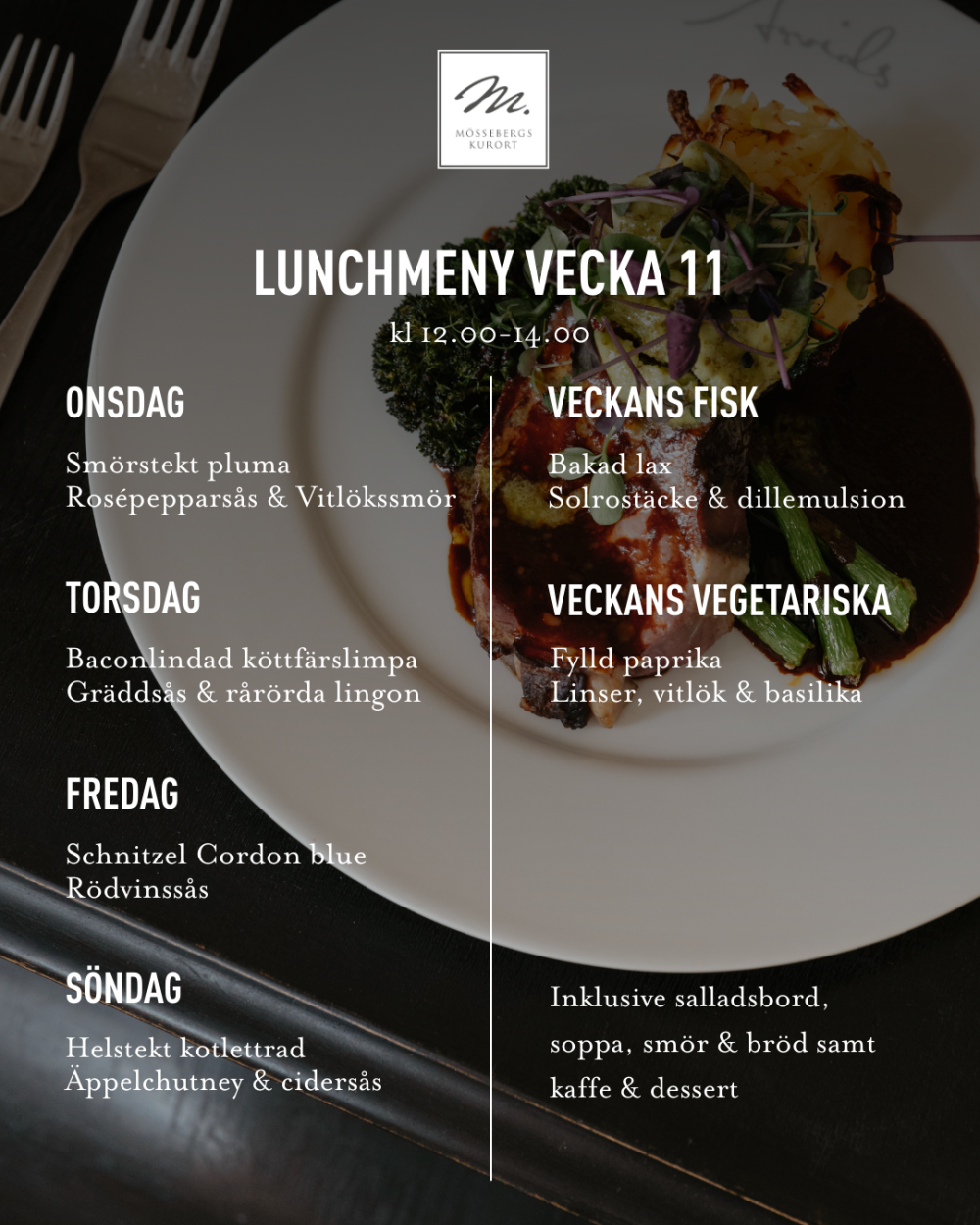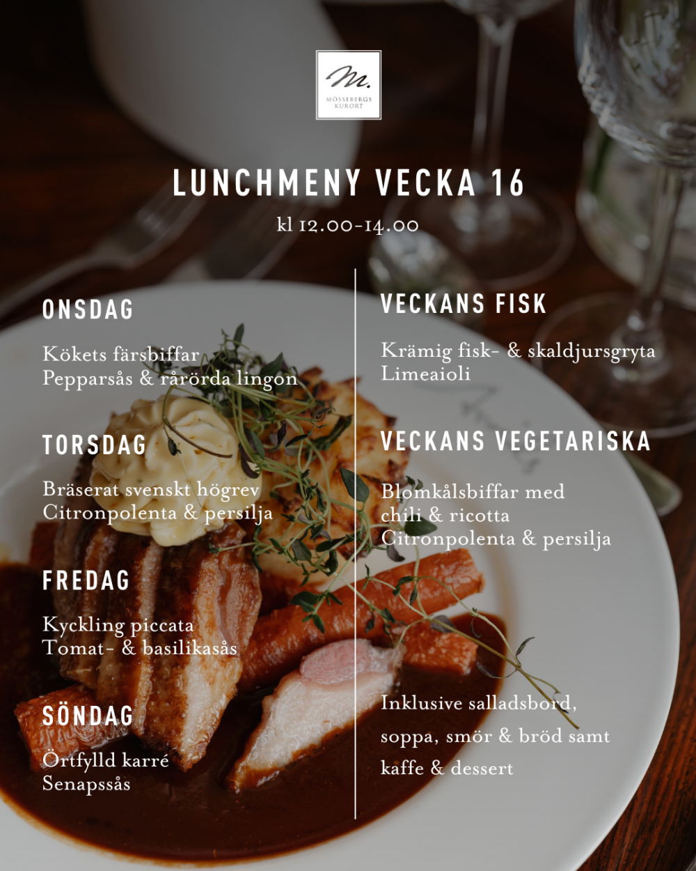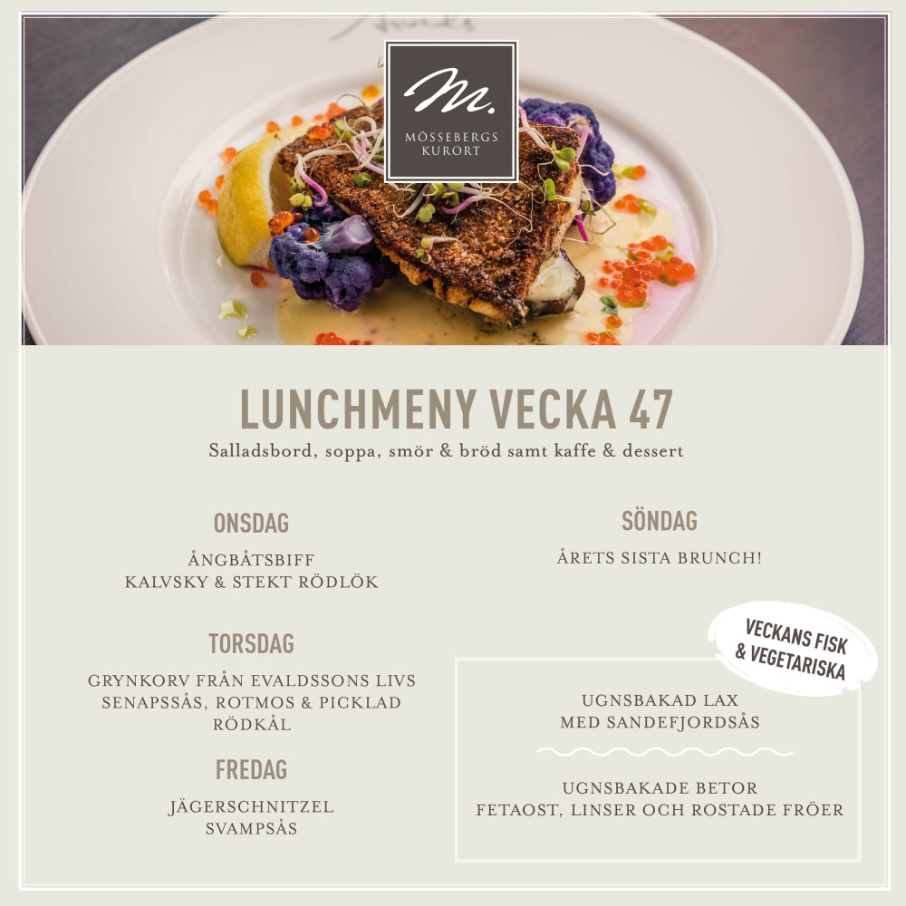 Seniorlunch, för dig 65+: 155kr, ons - fre kl 13.00-14.00 (Bordbokning krävs för att vi ska kunna garantera plats, gäller ej röda dagar)