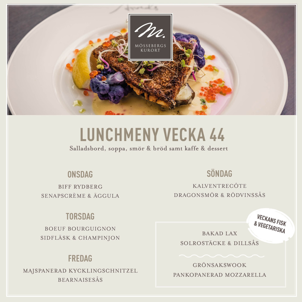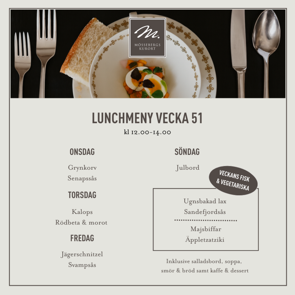Välkommen på lunch på Kurorten och njut av salladsbord, soppa, smör och bröd, varmrätt samt kaffe och dessert
